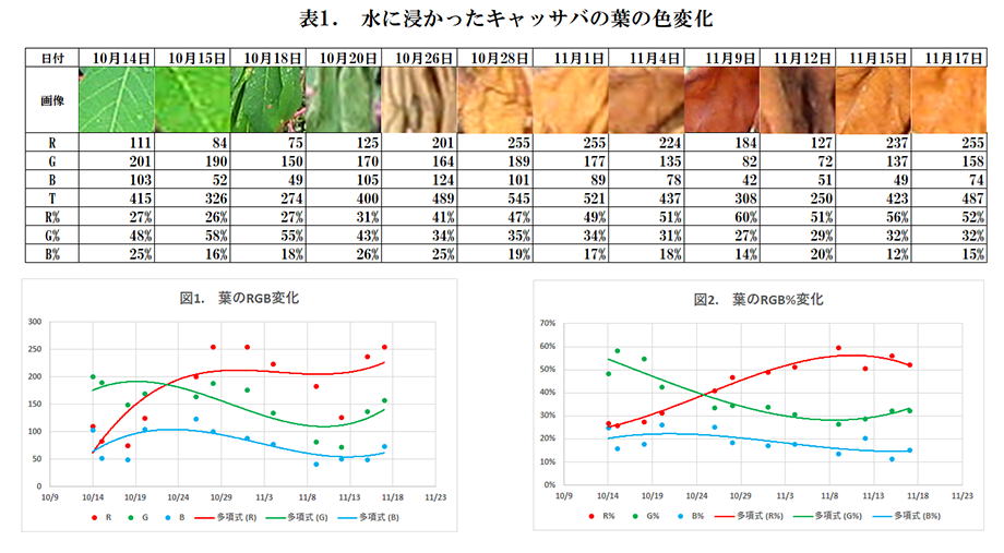 表1に水に浸かったキャッサバの葉の色変化を示した。