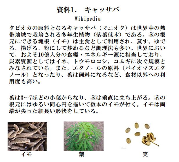 資料2のように家で子供がキャッサバの苗木を植えている様子が書かれていた。