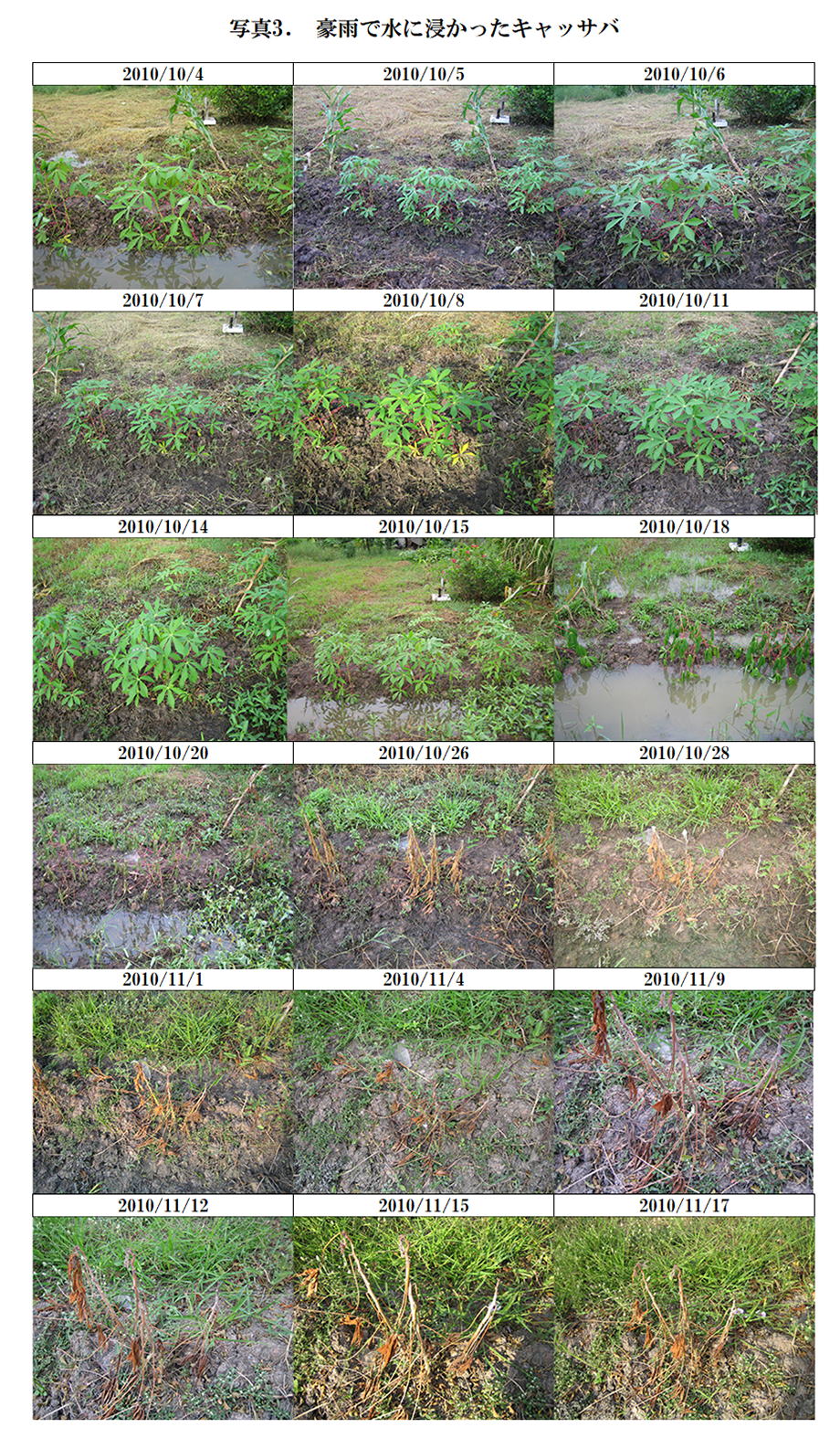写真3に示すように豪雨で冠水すると、葉は萎みすぐに枯れ始めた。