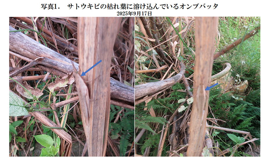 母屋玄関の前のサトウキビを良く見ると、サトウキビの枯葉にまるで溶け込んでいるような昆虫を見つけた。(写真1)