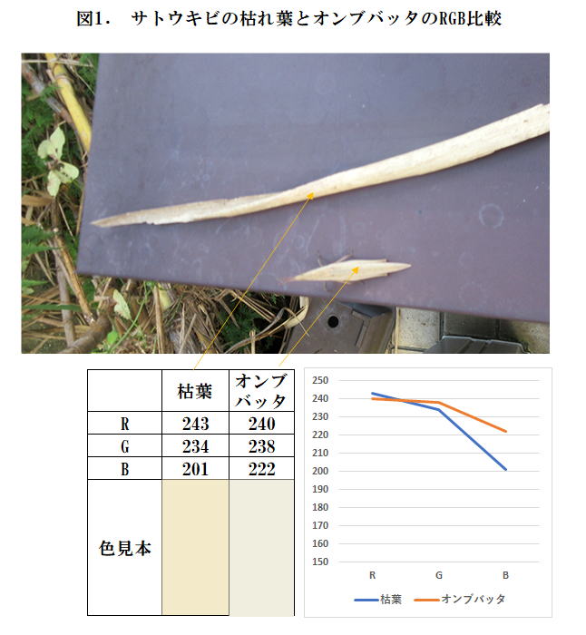 図1にサトウキビの枯葉をオンブバッタと並べて撮影し、そのRGBを比較した。