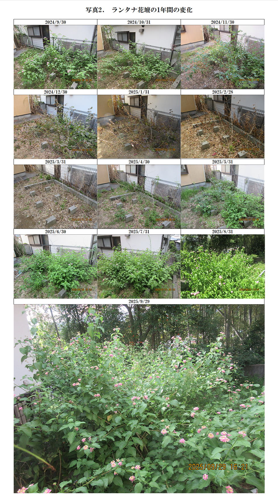 研究室の庭のランタナの花壇の中で蛇が花の咲いたランタナを登っていくのを見つけた。(写真1) 何という蛇かは分からないがまだ子供のようである。 このランタナ花壇の過去の経過については第605節に示した。 写真2はその後の1年間の経過である。 冬になると葉を落として茎も枯れてしまうように見えるが、春になると新たな茎が生えてきて葉をつけ始める。 今はランタナの森のようだ。 コレクションリストに戻る