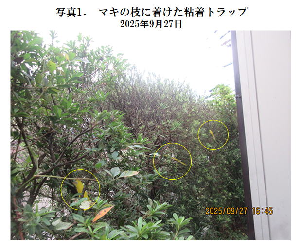 さらに卵を生みに来る成虫を捕獲するために粘着トラップを写真1のように設置した。