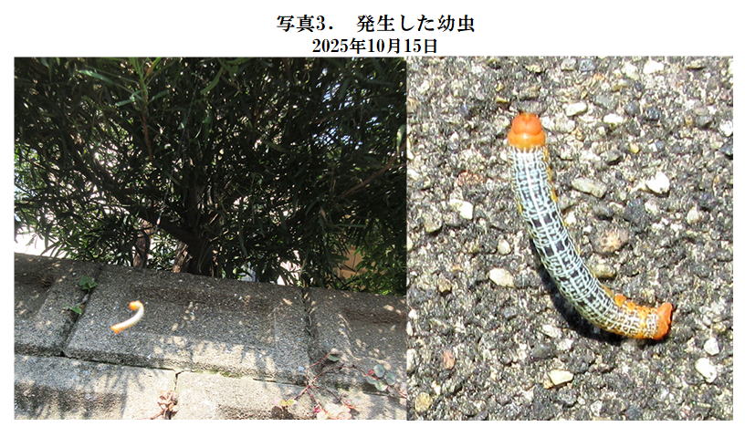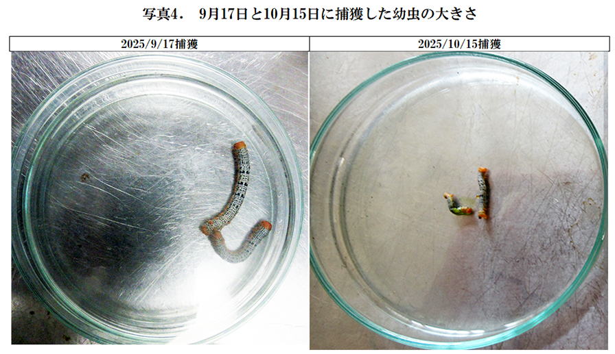 ただし、今回発生した幼虫の数は僅かであり、その大きさも小さかった。(写真4)