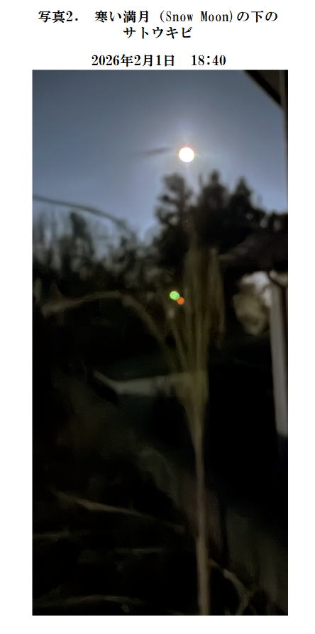 写真2は寒い満月の下で寒さに震えるY子さんのサトウキビである。
