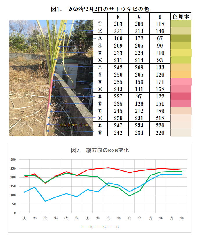 図1は2026年2月2日のサトウキビの姿とその色である。