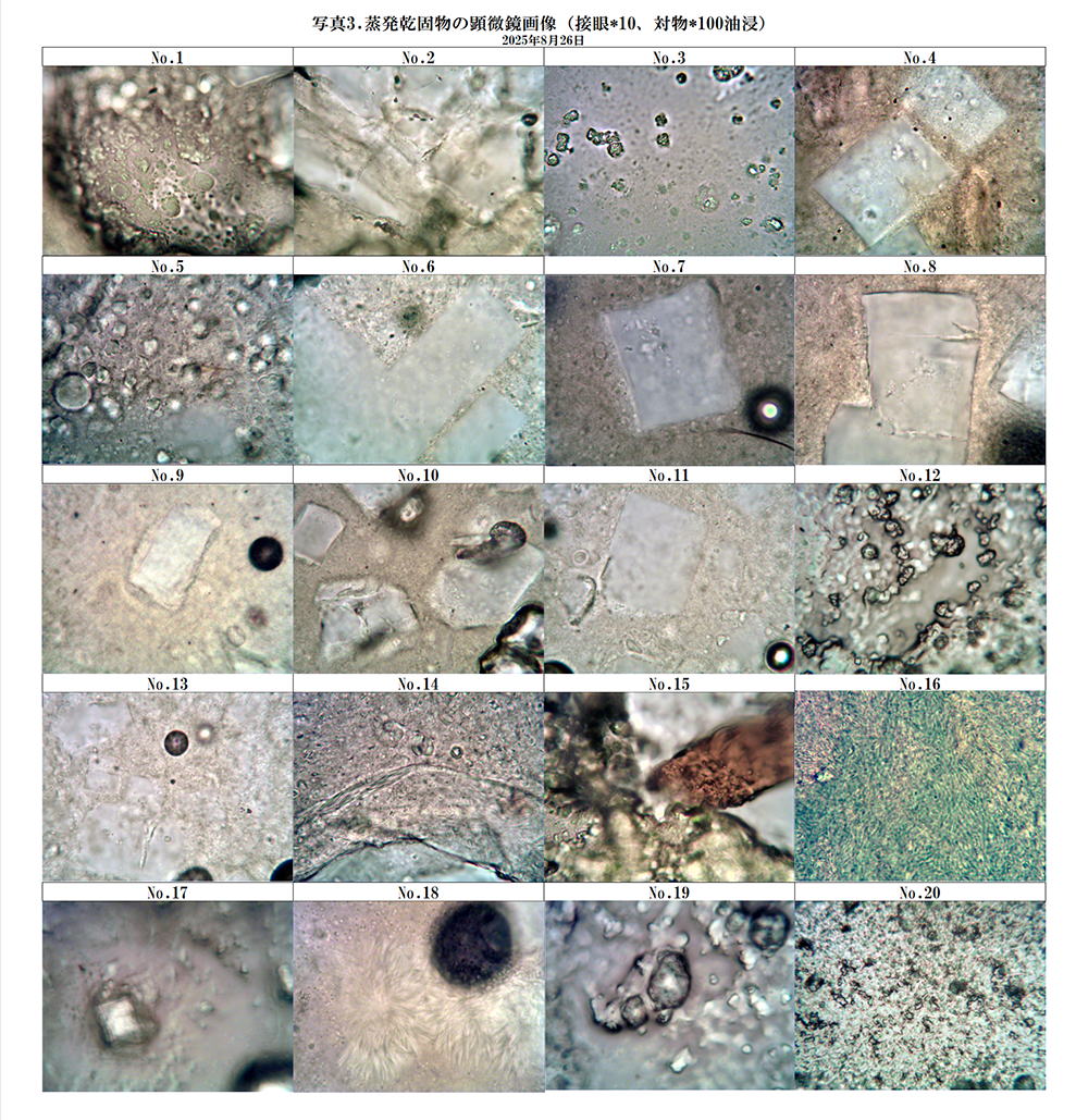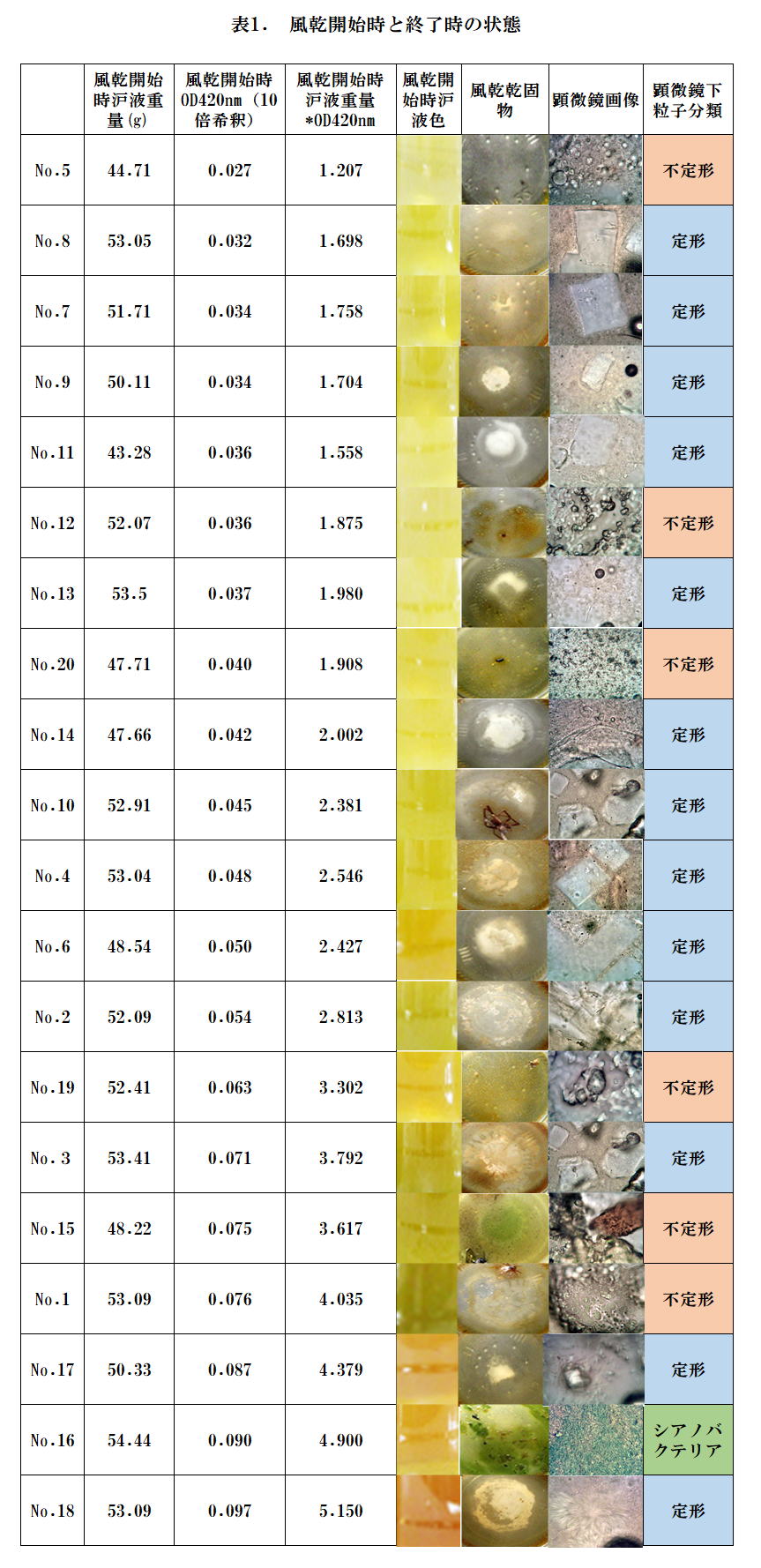 風乾乾固物の中心に白い斑点のあるサンプルには顕微鏡画像に定形の結晶粒子が認められた。
