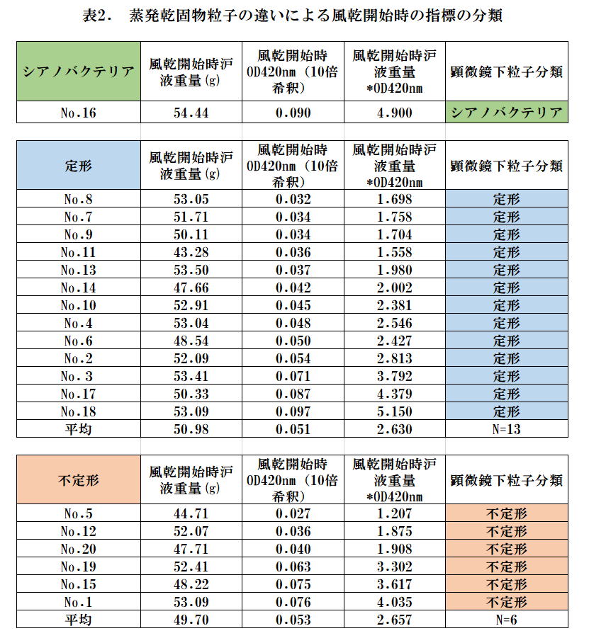 表2は蒸発乾固物粒子の違いによる風乾開始時の指標を分類したものである。
