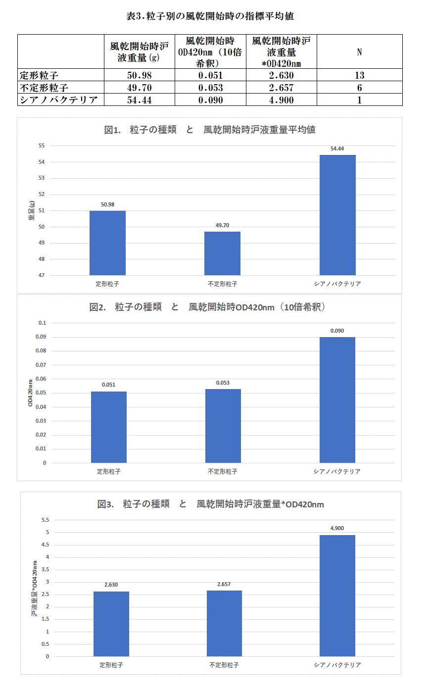 表3および図1,図2,図3は粒子別の風乾開始時の指標の平均値を比較した。