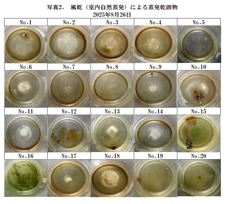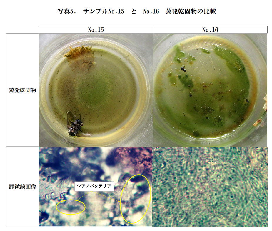 写真5はサンプルNo.15とNo.16の蒸発乾固物とその顕微鏡画像である。