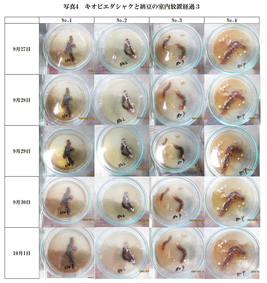 2025年9月18日に生きた幼虫をシャーレに入れ、納豆の添加量を変えて同じくシャーレに入れた。