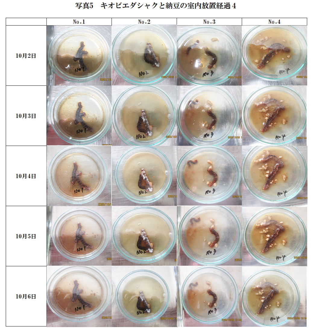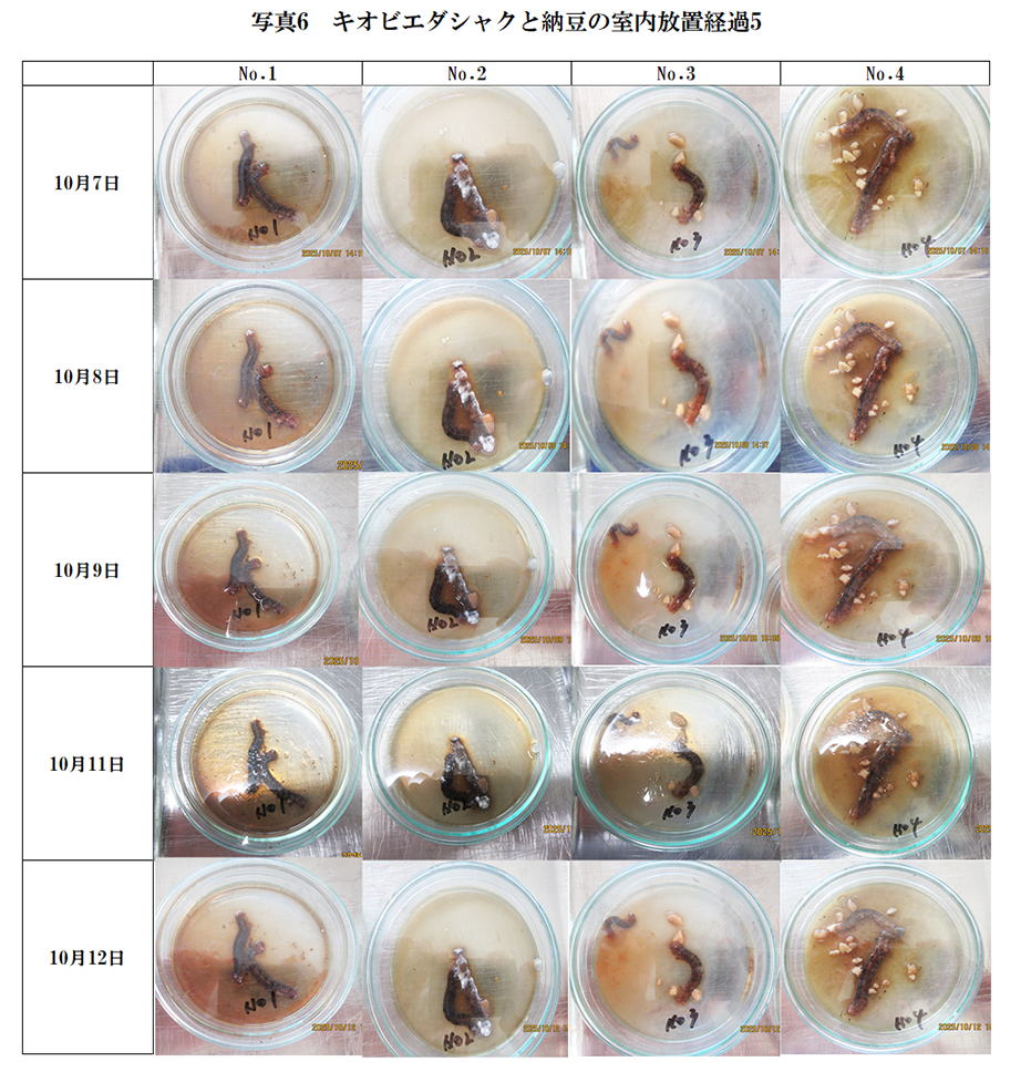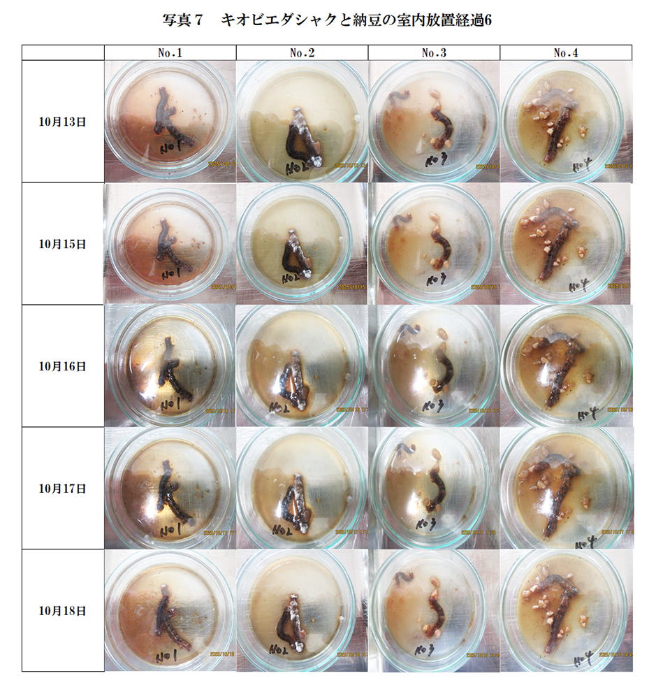 納豆添加量の最も多いNo4が赤みを帯びており、形が崩れてきた。