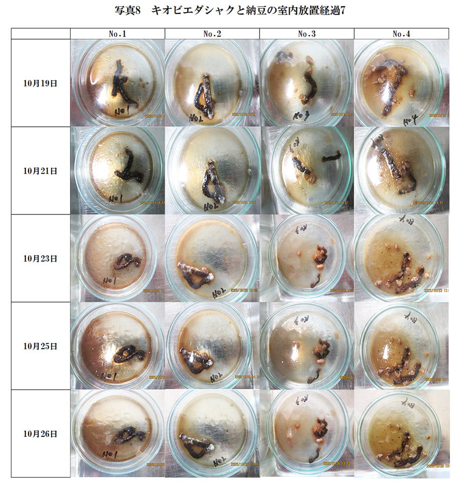 以上よりキオビエダシャクの幼虫は納豆の添加により完全に分解されるにはいたらないものの、かなりの分解が進行していると言える。