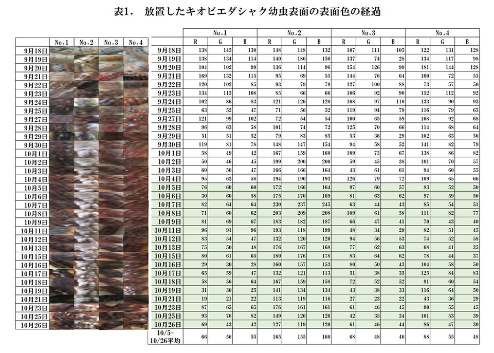 表1に放置した幼虫表面の色の経過を示した、