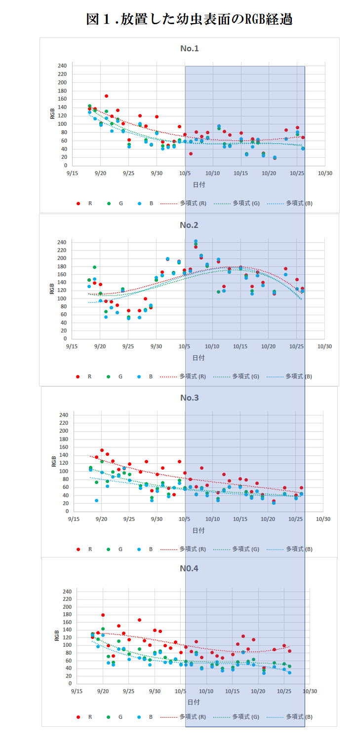 図1に放置した幼虫表面のRGB経過をし目下。