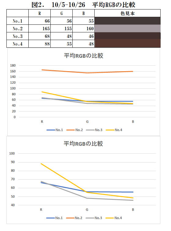 10月5日以後RGBの大きな変化はなくなったので、それ以後の平均RGBを図2に比較した。
