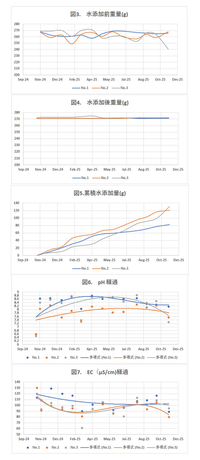 放置中の水分蒸発は水道水の添加で補填したが、図3は水添加前の重量、図4は水添加後の重量である。