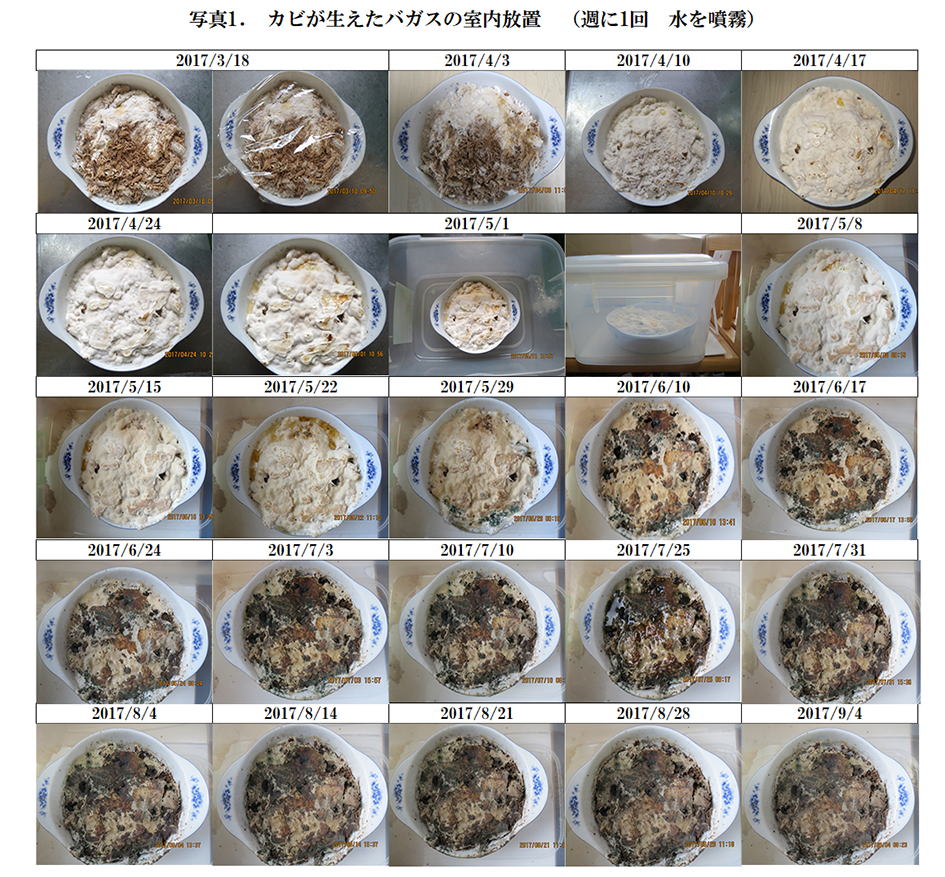カビが生えたバガスを表1に示した条件で室内に放置した。