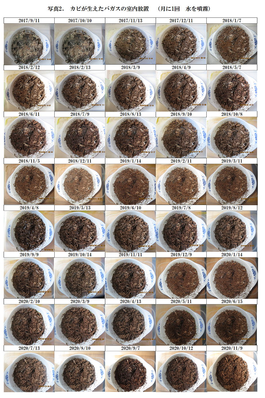 水の噴霧によりカビは急速に生長し、約1ヶ月でバガス表面を覆った。