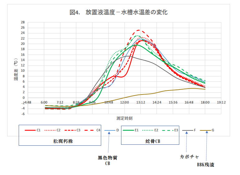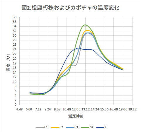 図2はサンプル瓶が同じ大きさのC松腐朽株とFカボチャの温度変化である。