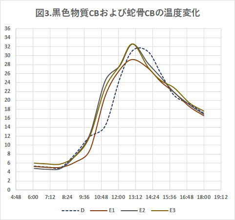 図3はD黒色物質CBとE蛇骨CBの温度変化である。